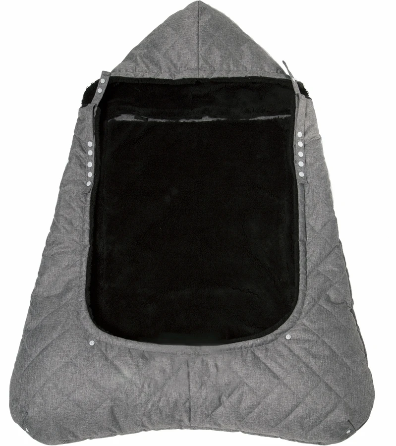 - Snapped system for leg muff corners and hood allowing for carrying baby facing outward or inward