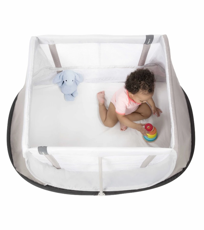 Perfect for nap time or play time, the AeroMoov Instant Travel Cot weighs less than 11 lbs, making it one of the most lightweight yet sturdy playards on the market. It’s easy to set up and dismantle in just 2 seconds. It’s compact and convenient to store, as it folds to less than 5 inches wide and can be easily packed away in a convenient carrying bag (included).