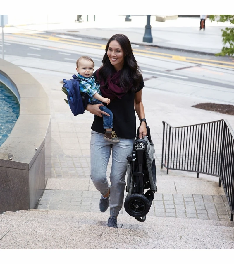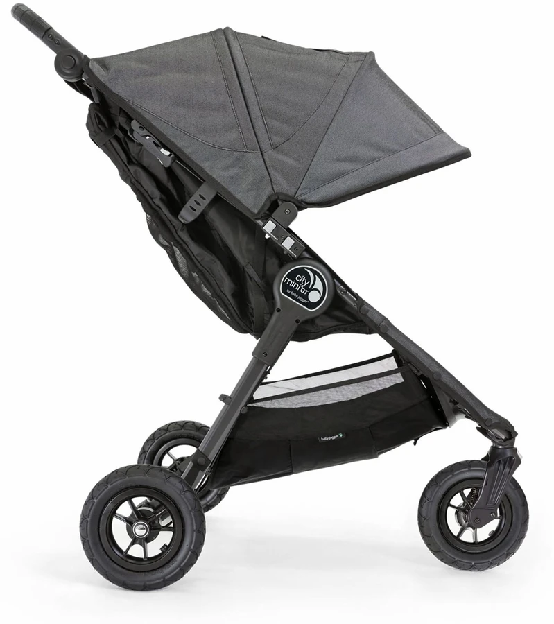 The City Mini GT captures the essence of the City Mini but gives you the ability to pave your own way. It features the City Mini quick fold and is travel system compatible. With the addition of all-terrain wheels, an adjustable handlebar and hand-operated parking brake, you decide how far you want to go off the beaten path. The City Mini GT has a 65 lb weight capacity, and is not intended for jogging.