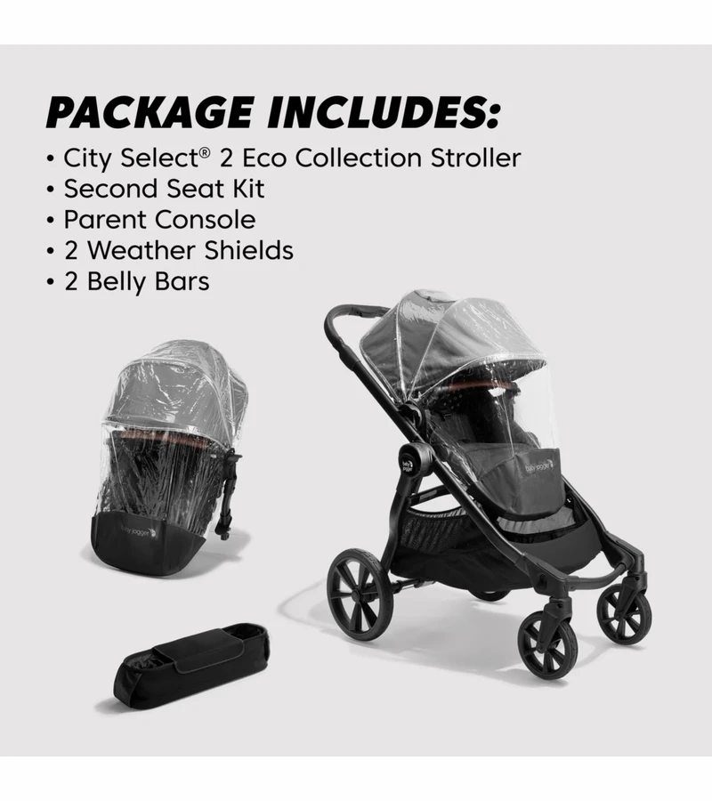 - Package includes: City Select® 2 Stroller, City Select® Second Seat Kit, 2 Weather Shields, and a Parent Console