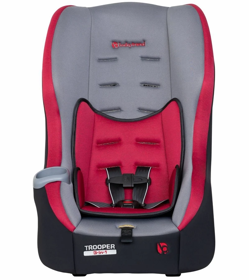The Baby Trend Trooper 3-in-1 Convertible Car Seat converts from rear-facing infant seat (4-18lbs) and rear-facing toddler seat (18-40lbs) to forward-facing toddler seat (22-65lbs) as your child grows. With 5-position shoulder height adjustment and 3- position crotch buckle for seat adjustment, the Trooper convertible gives parents the ultra-convenience for installation and adjustment. The rear-facing recline flip foot also allows the Trooper to get great installation angles with ease. Trooper’s nimble frame can fit three across in most vehicles which is great for families that have more than one kiddo. The lightweight shell also allows for use of LATCH installation up to 55 lbs. The super-deep side wings offer better side impact protection and premium cushion, giving your babies great head protection and support. With premium fabric and the convenient integrated cup holder on the side, our Baby Trend Trooper 3-in-1 Convertible Car Seat truly gives your children the most comfortable and convenient commute/travel experience.