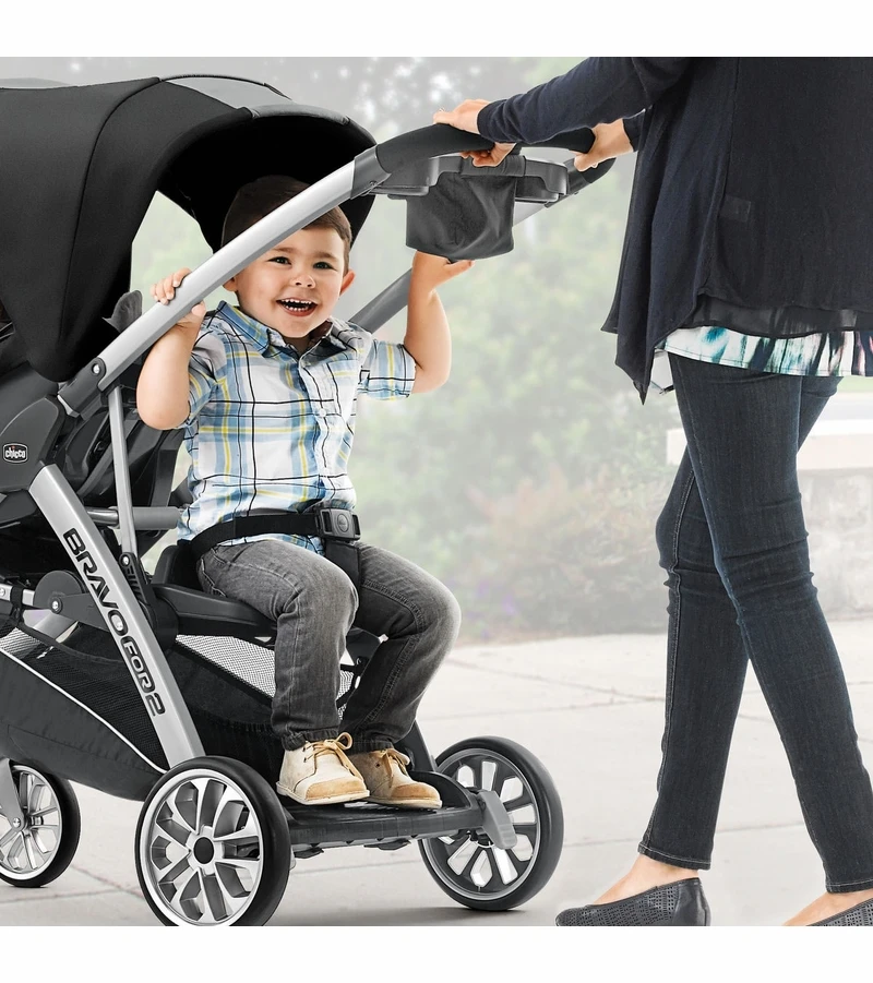 For older children, BravoFor2 is outfitted with a bonus back seat and platform where big kids can choose to ride rear-facing or stand and face the road ahead! The seat folds away easily when unoccupied and includes a three-point harness for added security. Easy-grip handles provide added stability for standing and a backrest gives extra support.