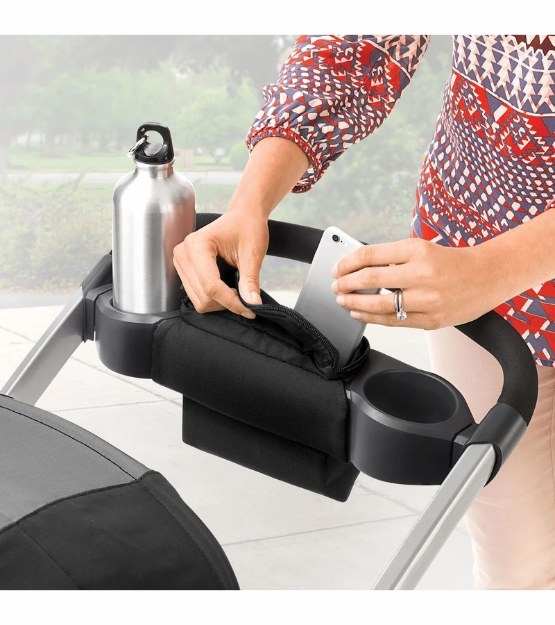 Full suspension and front swivels help maintain a smooth ride for both passengers in every configuration. One-touch brakes keep the stroller in place when parked. A padded push-handle, parent tray with two cup holders, and large storage basket with front and rear access provide added convenience for Mom or Dad.