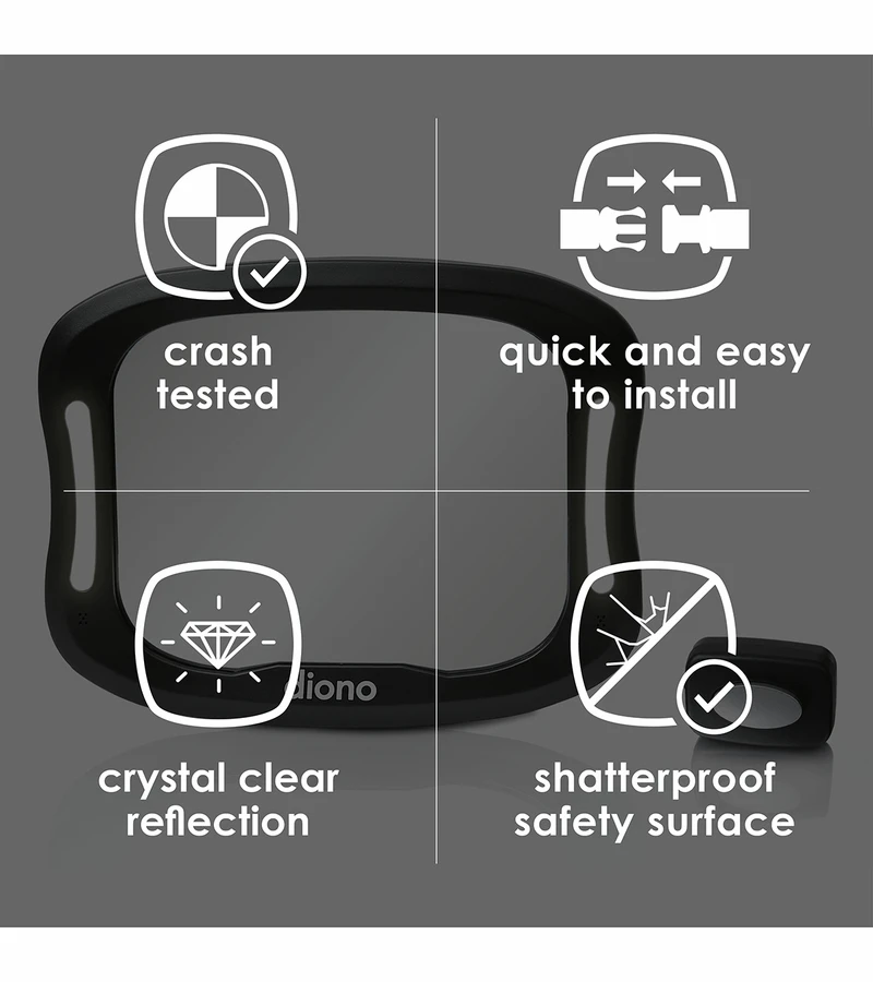 Great value 2 pack of Diono’s best-selling baby car mirror Easy View®, the original 360 rotating car mirror. We know you want to keep an eye on the baby but drive safely at all times. With the Easy View® mirror, you’ll have peace of mind knowing you can take a swift glance to the back seat while keeping your mind on the road.