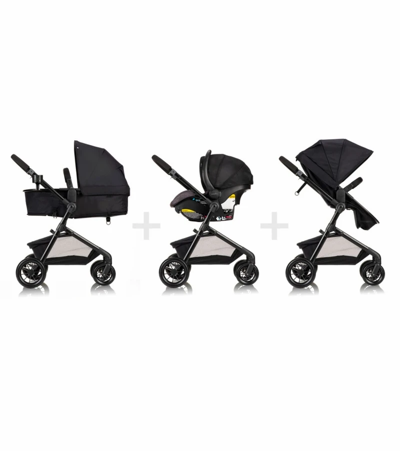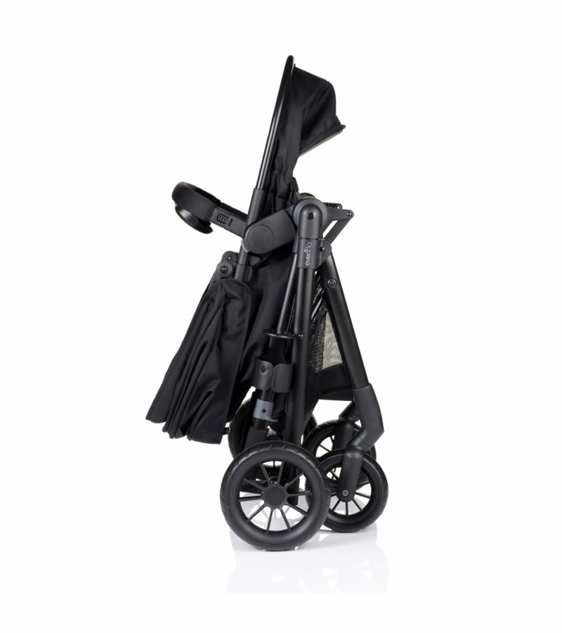 The Evenflo SafeMax car seat has been designed and tested for structural integrity at energy levels nearly two times the federal crash test standard. Weve also tested this system to simulate a side-impact event and rollover event. Plus, it includes a stay-in-car base that allows for a quick and safe infant car seat connection from stroller to car and vice-versa. The feature-rich stroller includes cruiser tires to make it easy to navigate over multiple surfaces, a large canopy with a peek-a-boo window, an over-sized storage basket, removable arm bar with cup holder and snack tray, and convenient self-standing fold.