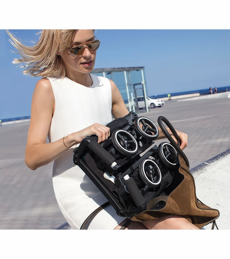 The cleverly designed, compact fold uses the 2 x 2 D technique. This means that in only two steps, this unique stroller folds up into a compact, feather-light, handbag shaped package (9.5 lbs). Perfect for when you are on the move, and practical and easy to stow away when you?re not. It even fits into any plane or train overhead compartment!