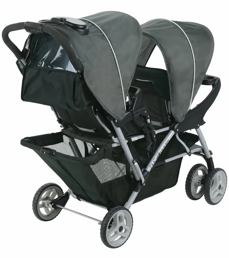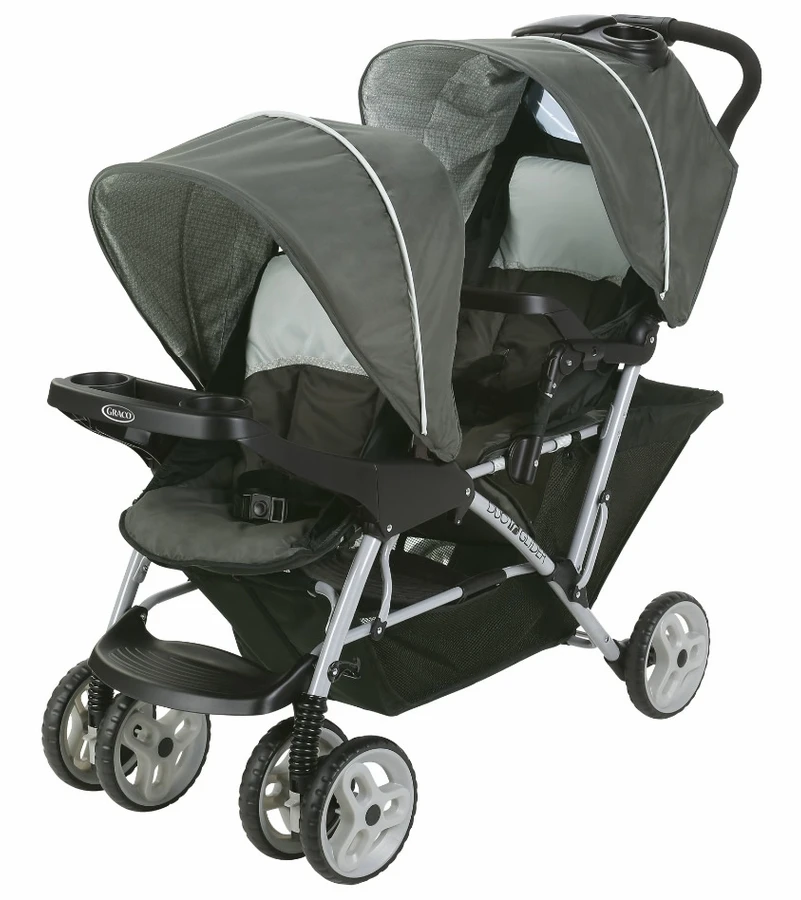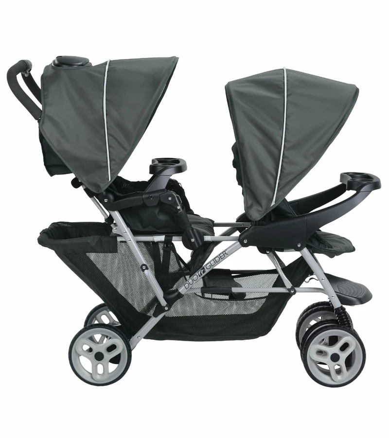 Comfy adventures for two, plus you. The DuoGlider Click Connect Double Stroller has all the essentials a growing family needs. This lightweight double stroller features stadium-style seating, so the child sitting in the rear is slightly raised for a better view. To keep both passengers nice and comfy, both seats feature a reclining seat, child’s tray, rotating canopy and footrest. And for Mom, a one-hand fold, extra large storage basket, and parent’s tray. The DuoGlider tandem stroller accepts two Graco infant car seats, too.
