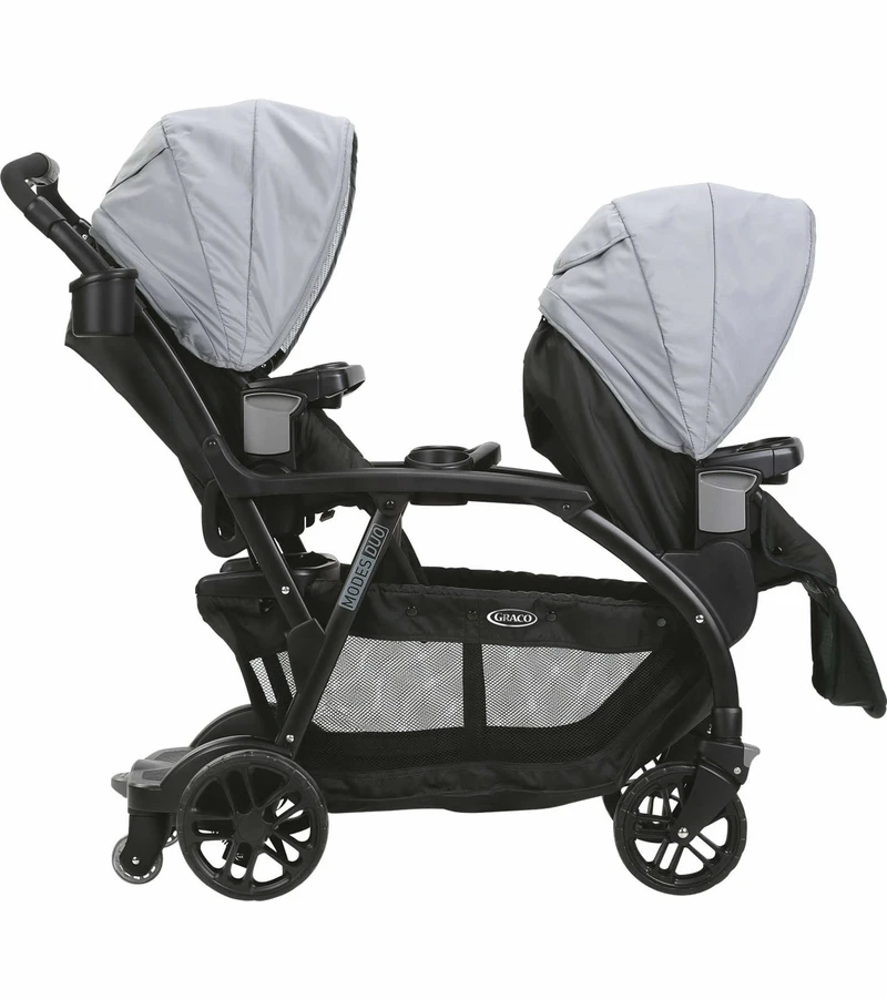 The Graco Modes Duo double stroller is extremely versatile! With 27 riding options, from infant to youth, you can configure this stroller for the best fit for your growing family. The Graco Modes Duo Stroller accepts TWO Graco Click Connect Infant Car Seats, connecting with a secure one-step attachment. It has a standing platform and bench seat for your older child, and two reclining, removable seats that allow for stroller customization. Convenience and comfort features include locking front swivel wheels for increased maneuverability, extra platform wheels, one-handed standing fold, and pivoting child?s arm bar with cupholders. The Graco Modes Duo Stroller helps you get the most out of every ride!