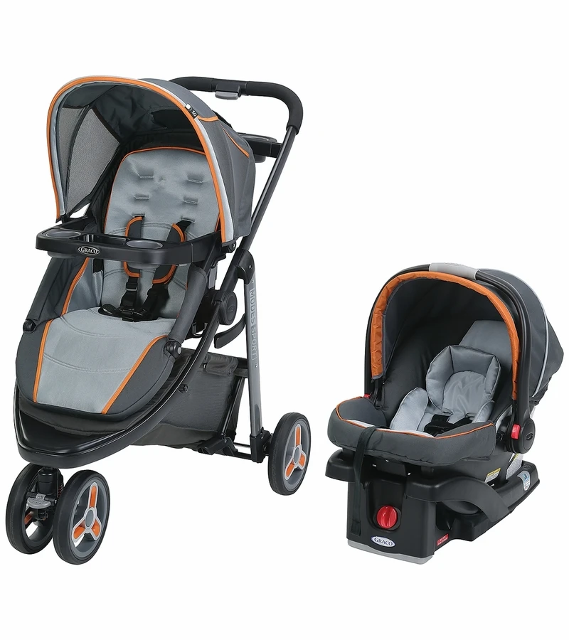 The Graco Modes Sport Click Connect Travel System truly grows with your child from infant to toddler. It is 3 stylish strollers in 1 and provides 10 versatile riding options, and it includes the Graco SnugRide Click Connect 35 Infant Car Seat, holding your infant from 4 – 35 lbs. The reversible stroller seat allows your little one to face you, reclines flat to create an infant carriage and then converts to a forward-facing toddler seat. Convenience and comfort features include a lockable front-swivel wheel for increased maneuverability, one-handed standing fold, parent?s storage tray and adjustable canopy with UV50 protection.