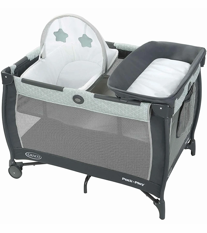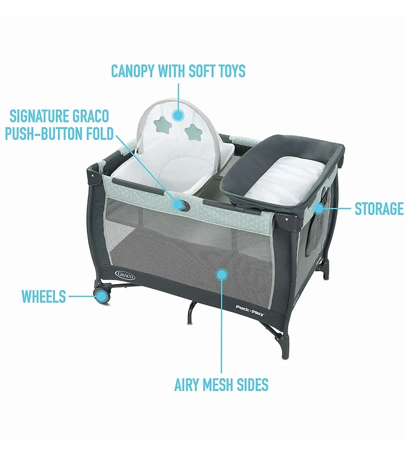The Graco? Pack ‘n Play? Care Suite? Playard features a cozy Newborn Napper? and diaper changer with wipe-clean fabrics to provide both comfort and convenience for you and baby. Care Suite? also grows with baby, from comfortable full-size bassinet to spacious toddler playard. This care station has integrated storage for baby’s essentials, a canopy with soft toys, wheels for easy portability, Graco’s signature push-button fold, and a convenient carry bag for easy storage and travel. The Graco? Pack ‘n Play? Care Suite? Playard provides a convenient care station for all of baby’s needs.
