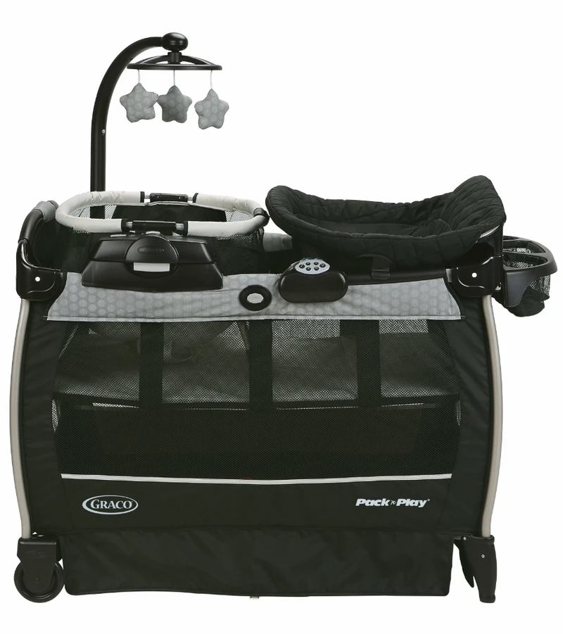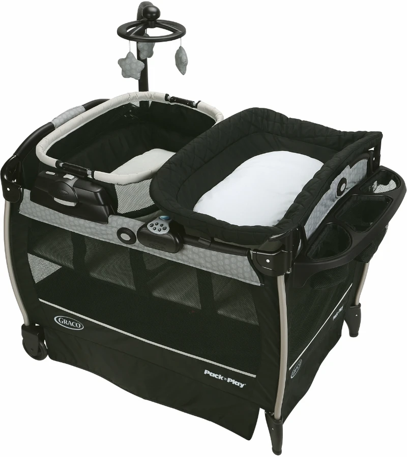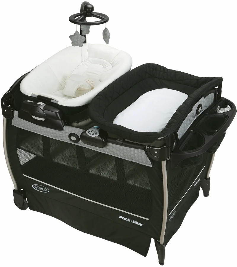 The Graco Pack ‘n Play Playard Nearby Napper is a comfortable spot, tailored for daytime rest or nighttime sleep. With the easy-switch reversible seat, you can use the inclined napper or flat nest bassinet in or out of the playard. The seat becomes a portable rocker with soothing, two-speed vibration and an engaging mobile to keep baby content. The removable, full-sized bassinet and roomy baby play yard allow it to truly grow with baby from newborn to infant to toddler. The extended use changing station (up to 30 lb) and integrated storage help make the playpen a joy to use!
