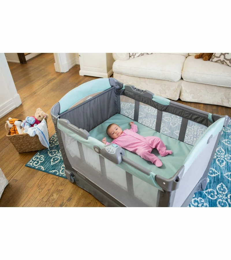- Portable infant seat removes from playard, keeping you connected with baby