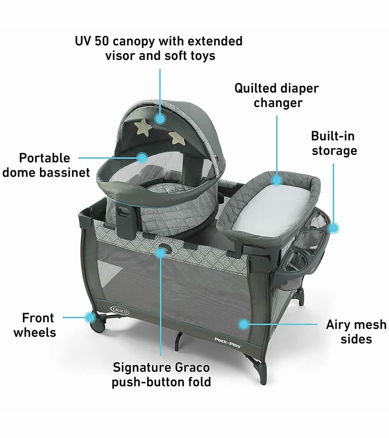 The Graco Pack ‘n Play® Travel Dome™ DLX Playard features a portable Travel Dome DLX bassinet that can be used in or out of the home, so that you can keep baby by your side anywhere. The removable bassinet features a UV 50 canopy with visor and carry bag, for comfort and convenience when you enjoy the backyard with baby or head to a park play date. When used on the playard, the bassinet can be positioned at eye level for easy check-ins throughout the night. This playard includes a removable quilted diaper changer with wipe-clean fabrics and an integrated storage area for baby’s essentials. The Graco playpen transitions with baby and can convert into a toddler playard with wheels for easy mobility around the home. Graco’s signature push-button fold makes it easy to fold up for storage. With Graco’s Travel Dome DLX Playard, baby is ready to go wherever you go!