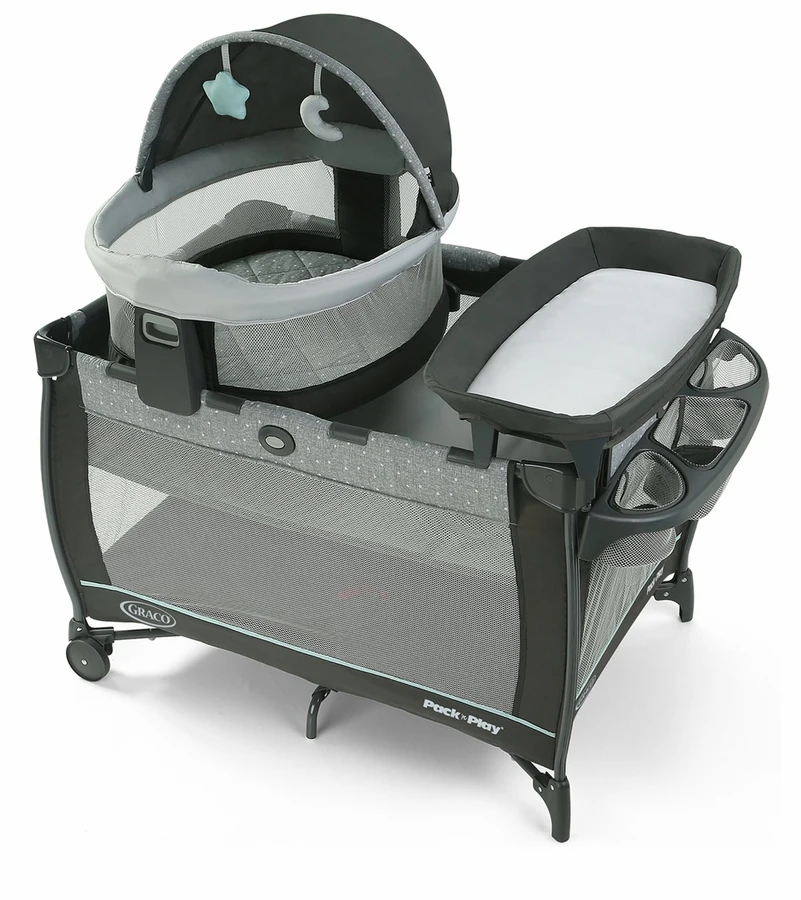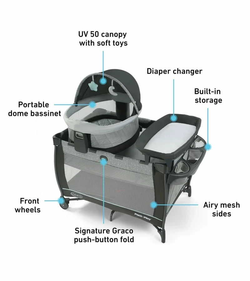 The Graco Pack ‘n Play® Travel Dome™ LX Playard features a portable Travel Dome LX bassinet that can be used in or out of the home, so that you can keep baby by your side anywhere. The removable bassinet features a UV 50 canopy and carry bag, for comfort and convenience when you enjoy the backyard with baby or head to a park play date. When used on the playard, the bassinet can be positioned at eye level for easy check-ins throughout the night. This playard includes a removable quilted diaper changer with wipe-clean fabrics and an integrated storage area for baby’s essentials. The Graco playpen transitions with baby and can convert into a toddler playard with wheels for easy mobility around the home. Graco’s signature push-button fold makes it easy to fold up for storage. With Graco’s Travel Dome LX Playard, baby is ready to go wherever you go!