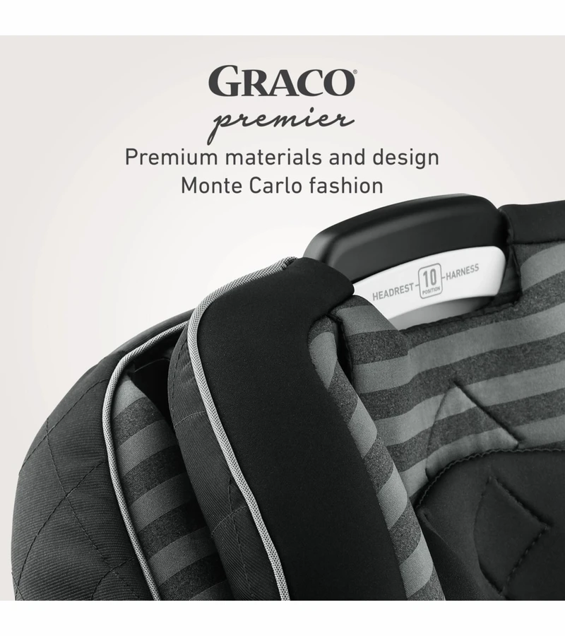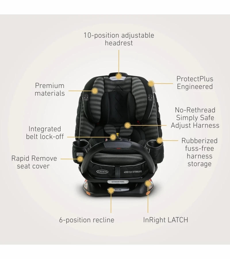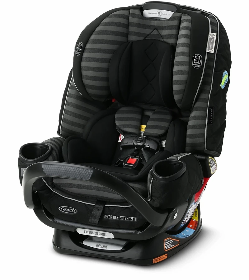 The Graco® Premier line offers premium materials and design. The Graco® Premier 4Ever® DLX Extend2Fit® 4-in-1 Car Seat featuring Anti-Rebound Bar gives you 10 years of use with one car seat, and allows your child to safely ride rear-facing longer. The 4-in-1 car seat transitions from a rear-facing harness (4–50 lb) to forward-facing harness (22–65 lb) to highback belt-positioning booster (40–100 lb) to backless booster (40–120 lb). The anti-rebound bar provides an additional layer of rear-facing safety by limiting rotation of the seat and your child in the event of an impact. The Extend2Fit® 4-position extension panel provides up to 5” of extra rear-facing legroom, allowing your child to safely ride rear-facing longer, up to 50 lb. The car seat is Graco® ProtectPlus Engineered™ to help protect in frontal, side, rear, and rollover crashes.
