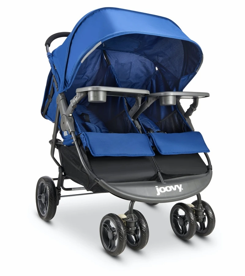 This version of our ScooterX2 double stroller adds two trays, complete with their own cupholders, so you can feed the kids on the go. Suitable for babies 3 months and up, all the way to children up to 45 lbs, the ScooterX2 double stroller has a total weight capacity of 90 lbs.