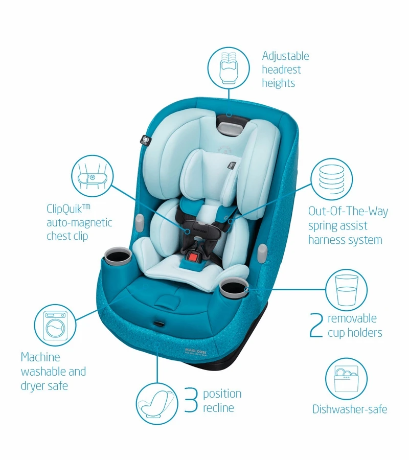 - All-in-One seating system: rear-facing, from 4-40 pounds; forward-facing to 65 pounds; and up to 100 pounds in booster mode