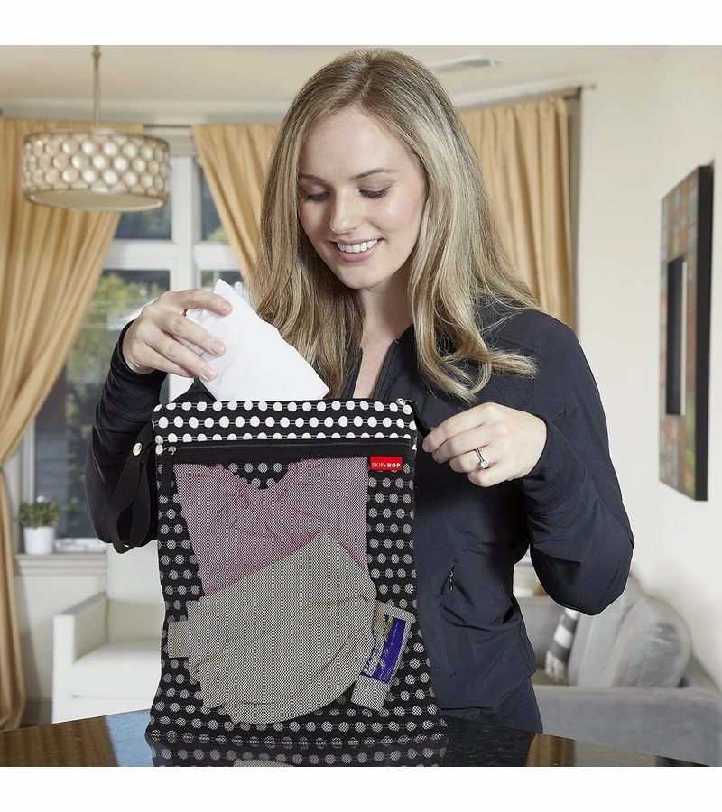 Two handy sections keep wet and dry clothes separated; or use one pocket to keep dirty diapers at bay. A handy strap makes it easy to attach to a stroller.