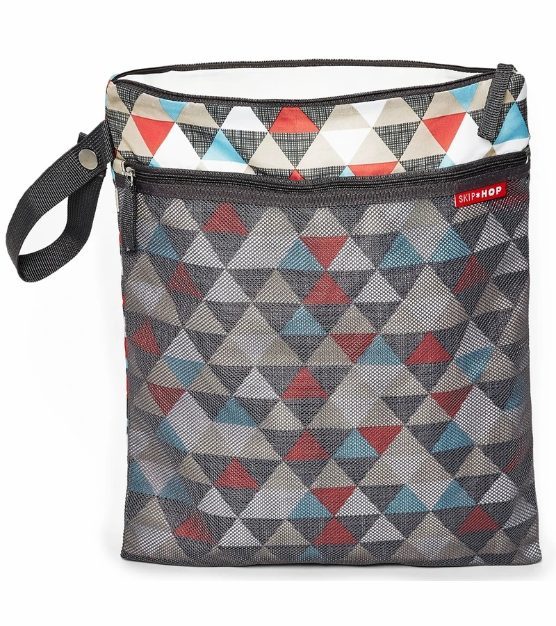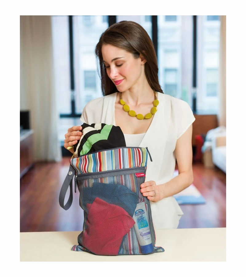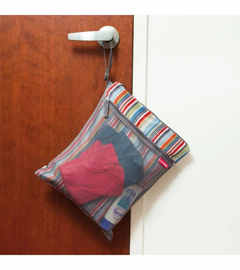 Two handy sections keep wet and dry clothes separated; or use one pocket to keep dirty diapers at bay. A handy strap makes it easy to attach to a stroller.