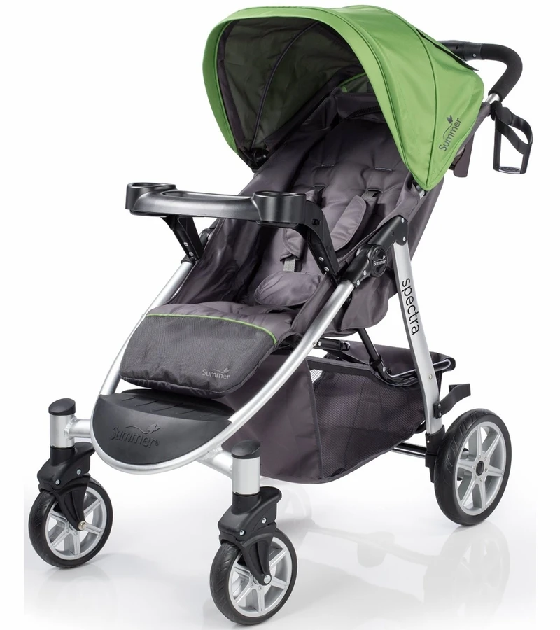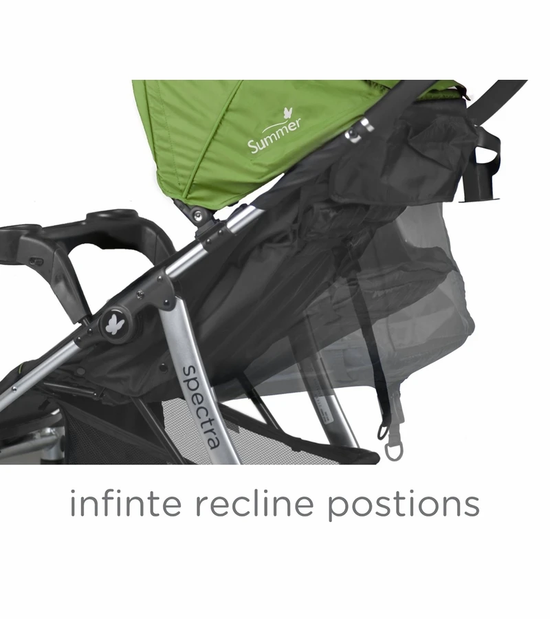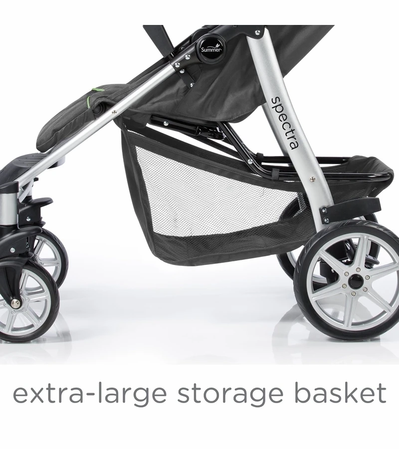 The Spectra Stroller has a new lightweight aluminum frame and sleek modern design that makes being on-the-go effortless. Featuring a simple 1-hand, self standing fold, multi-position reclining seat, adjustable footrest and child?s snack tray, this has all the features you are looking for in a full size stroller. Other conveniences include car seat compatibility (with Prodigy Infant Car Seat), parent cup holder, extra large storage basket for baby?s essentials, front and back suspension, peek-a-boo window and a pedicure friendly, easy-tap rear brake.